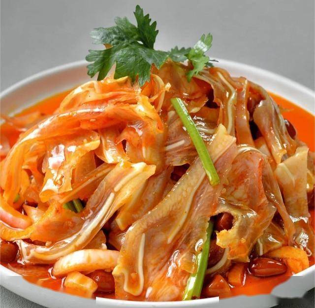 猪耳朵刮洗干净,冷水下锅,加葱姜、料酒和花椒,卤煮25分钟至能用筷子戳穿,捞出切细条。