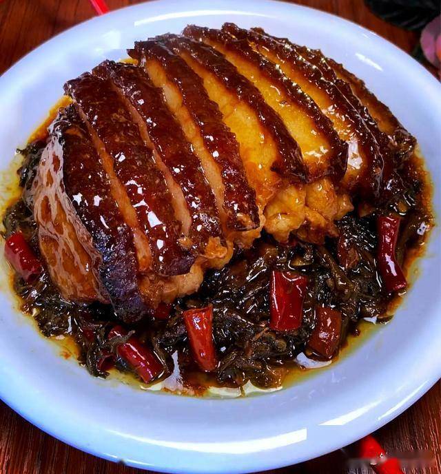 5、锅中烧油,油热放姜蒜、小米辣爆香,倒入梅干菜翻炒,加少许生抽提味,炒好的梅干菜铺在五花肉上,冷水上锅,水开上汽后蒸1.5小时,蒸好后倒扣在盘子上,撒葱花即可。