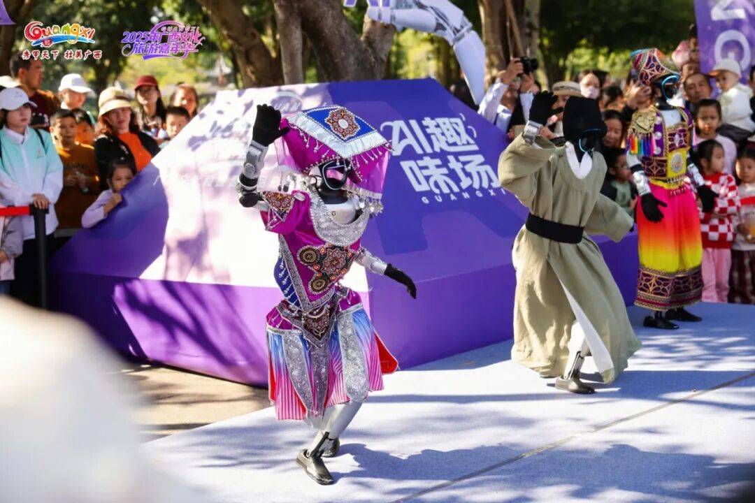 智能互动板块则亮点十足,其中机器人舞蹈表演尤为吸睛——数台机器人随着山歌旋律起舞,舞步兼具灵动与精准,流畅的动作赢得满堂彩,成为展区内的爆款场景。