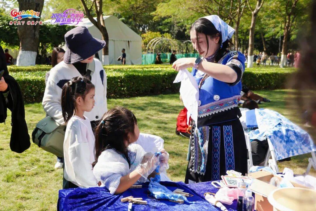 非遗体验区的摊位前始终围满观众:马山会鼓传承人手把手指导游客握槌击鼓,阵阵鼓声震彻现场;壮族扎染摊位上,游客小心翼翼翻转布料,看着专属纹样逐渐显现,惊喜之情溢于言表。
