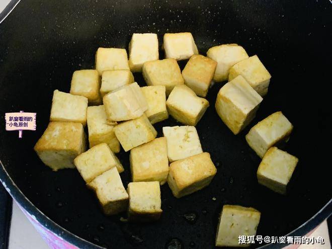 2、火上坐平底锅,锅热倒油,待油热后,将豆腐块倒入锅中,煎成金黄色,盛出备用。