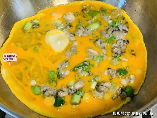 5、这时,用小勺将海蛎均匀下入。