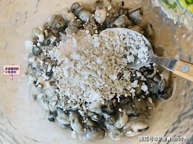 2、将海蛎肉放入大碗中,加入适量红薯淀粉,搅拌成细腻的糊状。(海蛎煎必用红薯淀粉,因为1:红薯淀粉具有出色的黏性和稳定性。能够将海蛎、鸡蛋等食材紧密地结合在一起,使得海蛎煎在烹饪过程中不易散开,保持完整的形状。2:红薯淀粉能够赋予海蛎煎独特的口感。经过煎制后,红薯淀粉会形成一层酥脆的外皮,内部则保持嫩滑,带来外酥里嫩的丰富口感体验。3:红薯淀粉的吸水性相对较强。它可以吸收海蛎在烹饪过程中释放出的水分,避免海蛎煎变得过于湿软,从而保证成品的干爽和香脆。)