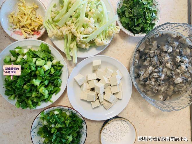 原料:海蛎肉、红薯淀粉、青蒜苗、菜花 、北豆腐、小葱碎、姜丝、香菜碎、食盐、胡椒粉、食用油